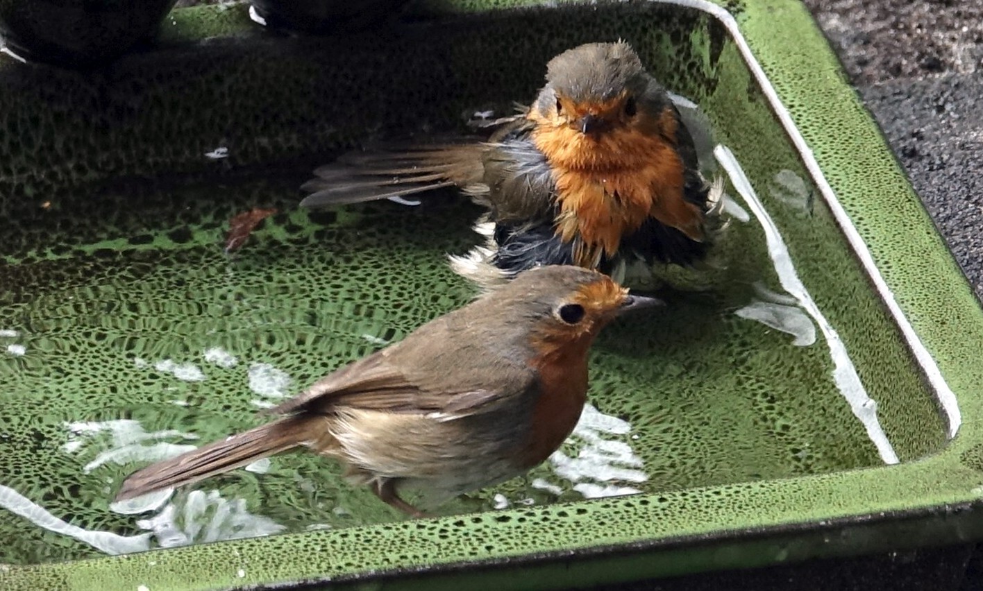Twee Roodborsten in bad Van: Wil Heemskerk maandag 13 april 2024 Twee Roodborsten in onze tuin nemen een bad, nog nooit twee samen gezien. Moet wel een stelletje zijn. Groeten, Wil