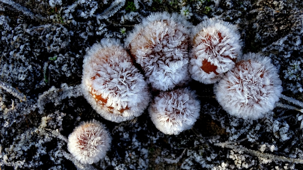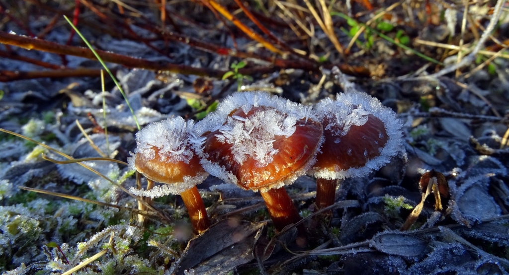 Maar in december waren op sommige plaatsen, veel groepjes van kleine paddenstoeltjes te zien in de Van Limburg Stirumvallei. Mooi om te zien met de witte rijp er bovenop, van de eerste nachtvorst.
