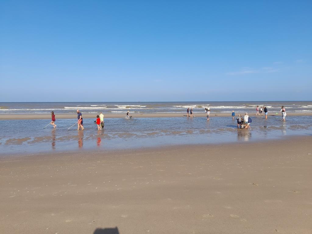 De kinderen begonnen met hun garnalennetjes te vissen in de grote kim. Al snel kwamen er in de gereedstaande emmers garnalen, krabbetjes en platvisjes. In de tussentijd werd het kornet gereed gemaakt. Dat was best nog weer een puzzel, want ja … hoe zat het ook alweer? Toch weer gelukt!