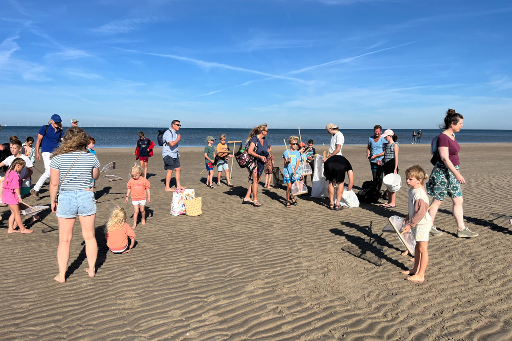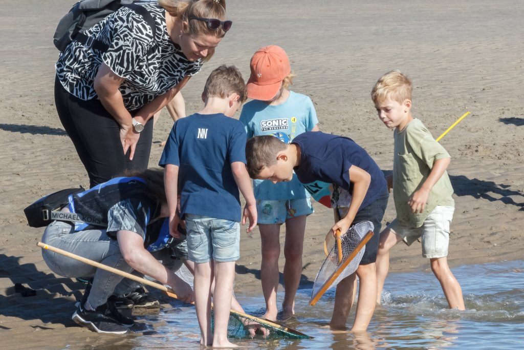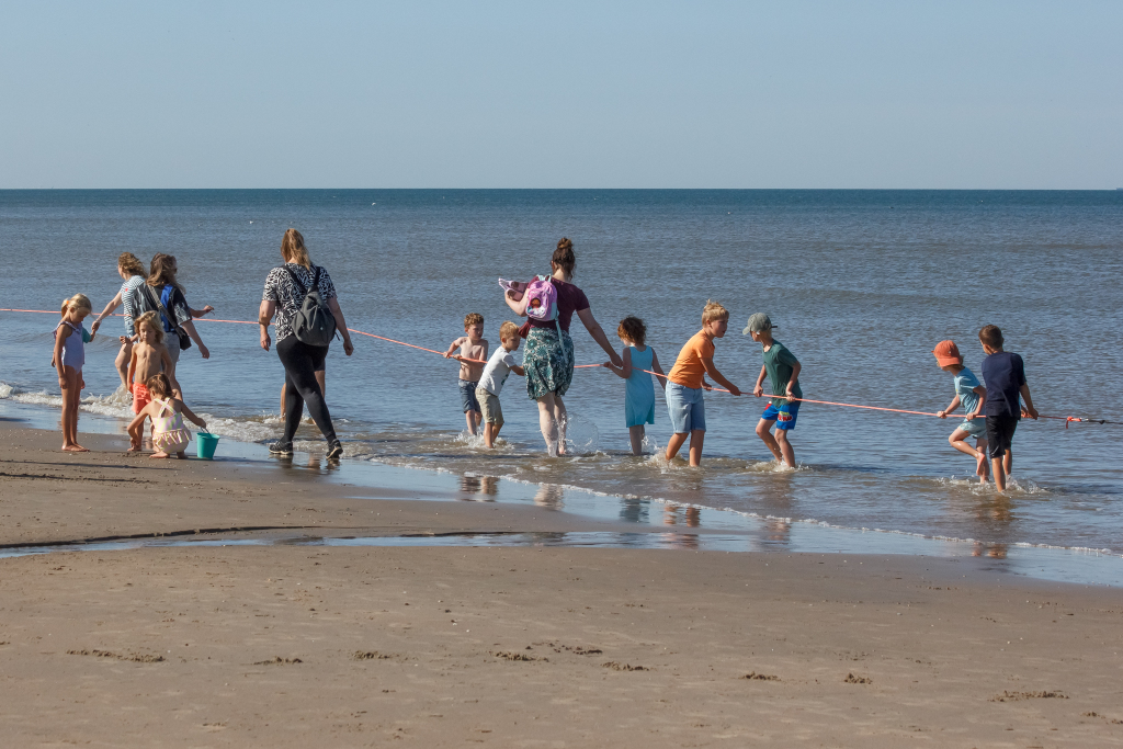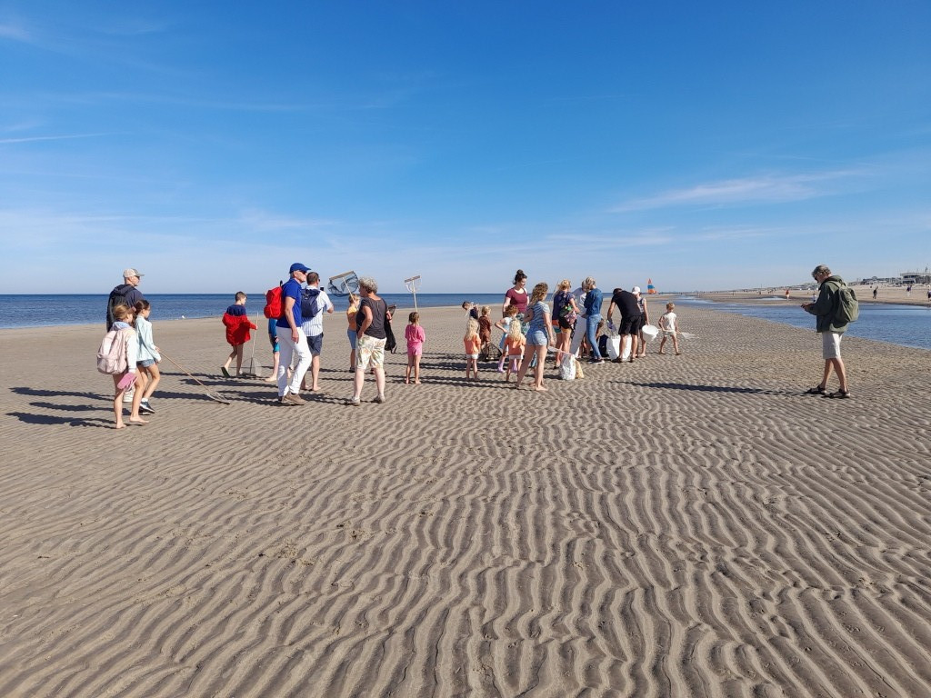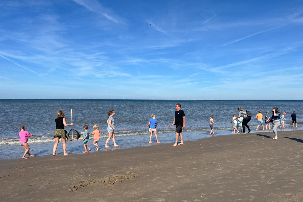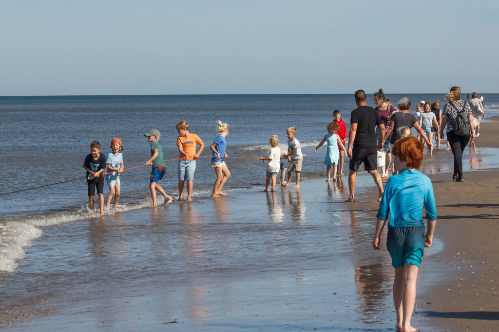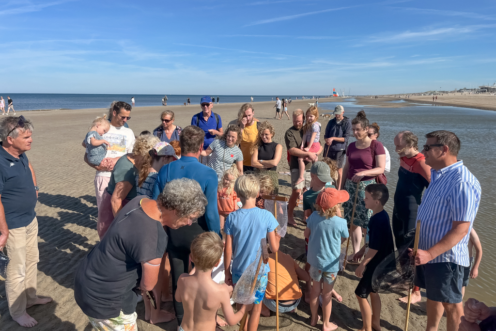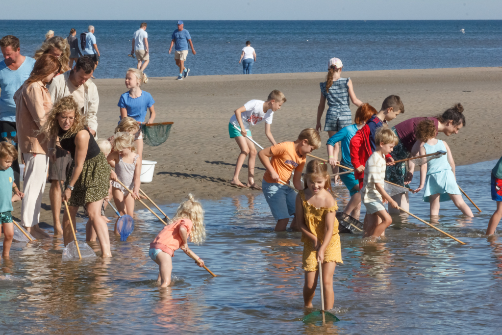 Op een stralende zondagochtend togen 22 enthousiaste kinderen, vergezeld van ouders, opa’s, oma’s, broertjes, zusjes naar het strand, op zoek naar zeediertjes. Met garnalennetjes werd eerst een zwinnetje ‘leeggevist’. Een recordvangst van Garnalen was het resultaat, veel Heremietkreeftjes, een enkel Krabbetje en een visje, en als bijzonderheid: een Kleine zeester en een Kleine zeeanemoon. Vervolgens ging het kornet de zee in. In zee werd dit voortgetrokken door Ruurd en Jaap, op het land geholpen door een lange stoet kinderen aan een touw, aangestuurd door Jaco. Ook hier was het weer verbazingwekkend, wat er gevangen werd: veel jonge Haringen die zo snel mogelijk weer teruggebracht werden naar de zee, en als bijzonderheid 5 jonge Zeekatten. Iedereen ging tevreden naar huis en het strand werd al snel overgenomen door de badgasten die van de ‘laatste’ zonnige dag kwamen genieten.