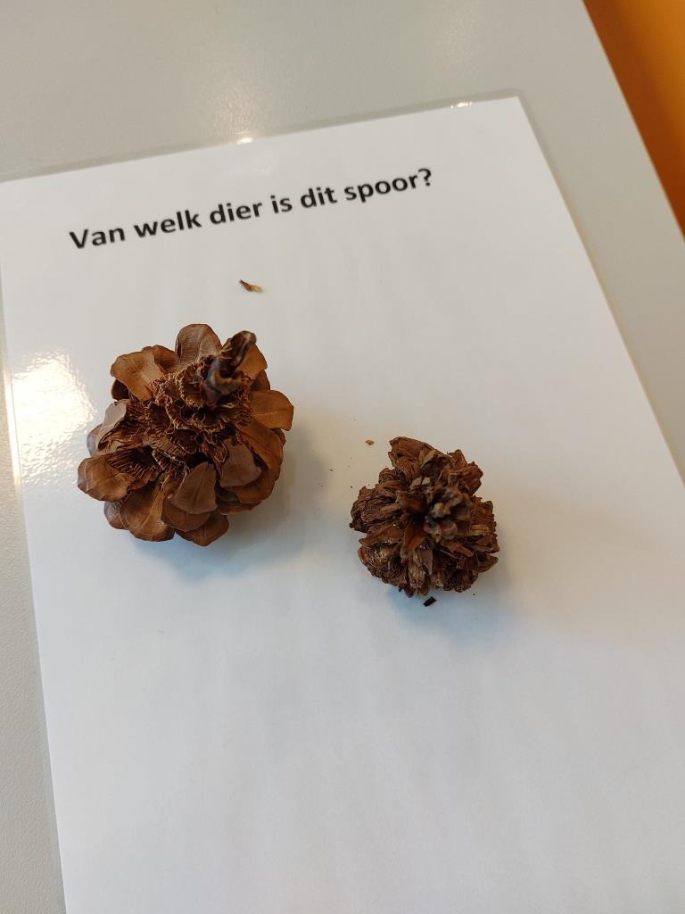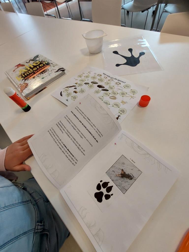 De kinderen kregen een werkboekje waarin verschillende dieren stonden. Verspreid door het centrum lagen verschillende pootafdrukken, met een zoekkaart erbij konden ze de juiste pootafdruk bij het dier zoeken en opplakken. Ook waren er nog andere diersporen te vinden, nl vraatsporen oa een dennenappel waar een eekhoorn heerlijk aan had zitten knagen. En een braakbal van een uil en ook ree en konijnenkeutels werden goed geraden.