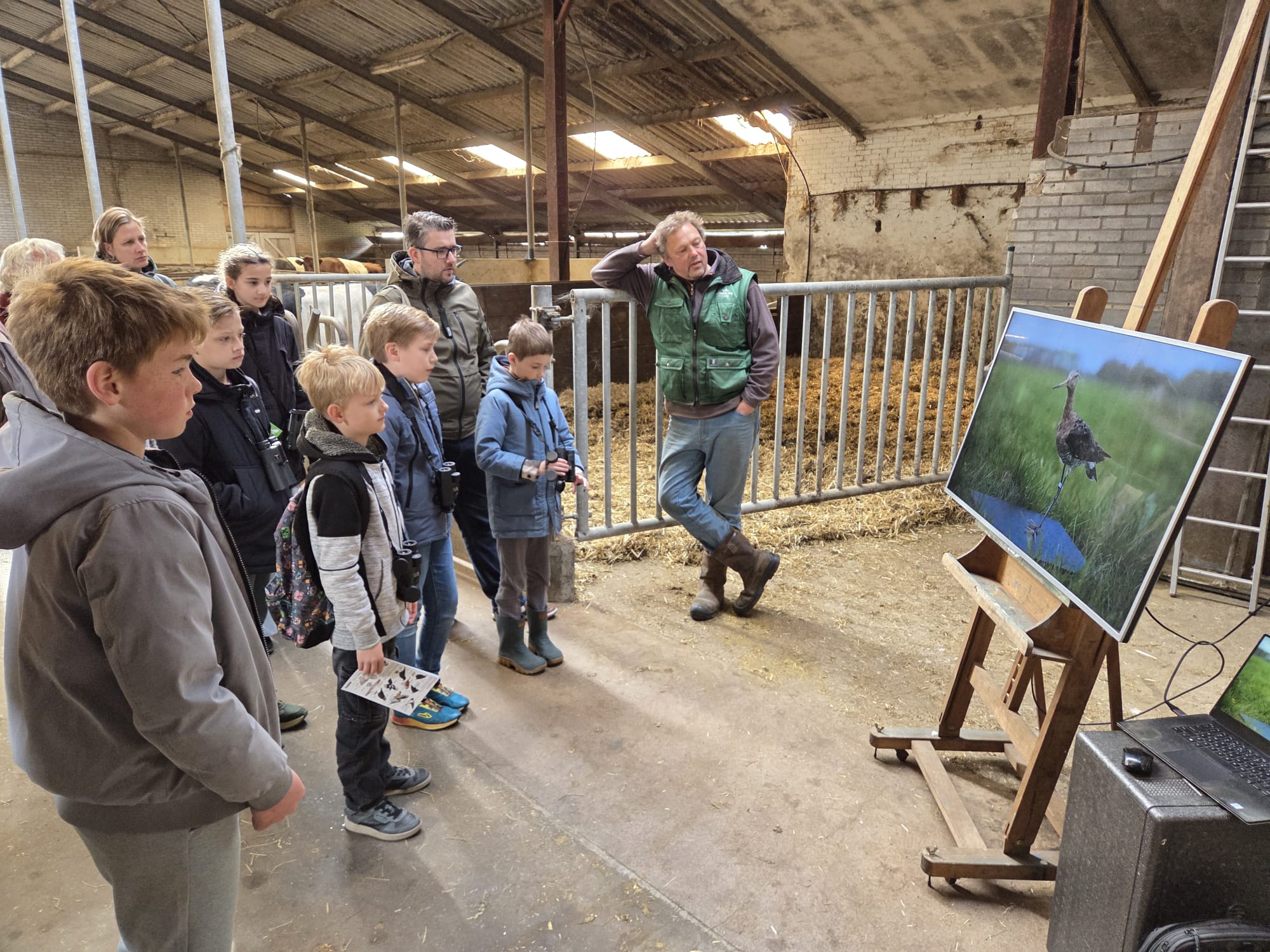 Zaterdagochtend 11 april organiseerde onze Educatieve werkgroep voor de eerste keer een weidevogel observatie voor kinderen. Ouders gingen ook mee, vanwege hun nieuwsgierigheid en interesse maar ook de afstand, want vanuit Noordwijk gingen we de Lakenvelder Boerderij Boterhuispolder in Warmond. 6 Kinderen deden uiteindelijk mee en 7 ouderen. Gastheer en boer Fernand ontving ons in zijn schuur met prachtige Lakenvelder koeien met koffie, thee en limonade en Peter, de begeleider van onze werkgroep, had stroopwafels meegenomen. Fernand vertelde uitgebreid over het ras Lakenvelder en het beheer van zijn kleinschalige en duurzame fokkerij van deze runderen. Zomers staan ze buiten in de wei en in de winter op stal. Op de boerderij wordt op een natuurinclusieve manier gewerkt, dat wil zeggen met oog voor biodiversiteit en weidevogels. Deze weidevogels hebben een kans in zijn weilanden te nestelen en hun kuikens te laten opgroeien, omdat Fernand het gras niet maait in hun broedseizoen en er daarom genoeg bloemen en planten groeien, die weer insecten aantrekken waar de vogels en hun kuikens van eten. Nadat de kinderen hun verrekijkers en vogelzoekkaarten hadden gekregen van Peter en Grietje, een andere begeleidster die er bij was, en een kort filmpje over weidevogels, liepen ze van de schuur naar het weidse weideland en tuurden ze door hun kijkers en zagen ze allemaal achteréénvolgens, Kievitten, Grutto’s, en Tureluurs zowel in de lucht als op de grond. Enkelen zagen ook Scholeksters. Natuurlijk waren er ook Zwanen, allerlei soorten eenden en Hazen! De kinderen keken letterlijk hun ogen uit. Nina, één van de kinderen, bracht ook nog even het paard en de pony van de stal naar de wei. Er werden ook nog wat uilenballen verzameld uit de stal. Boer Fernand werd op het eind bedankt voor zijn gastvrijheid en de drankjes. Zo was het een gezellige, leuke en leerzame ochtend.